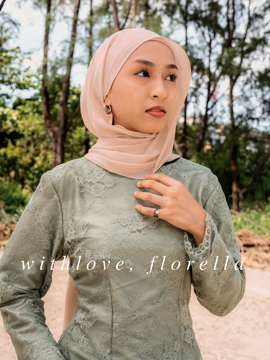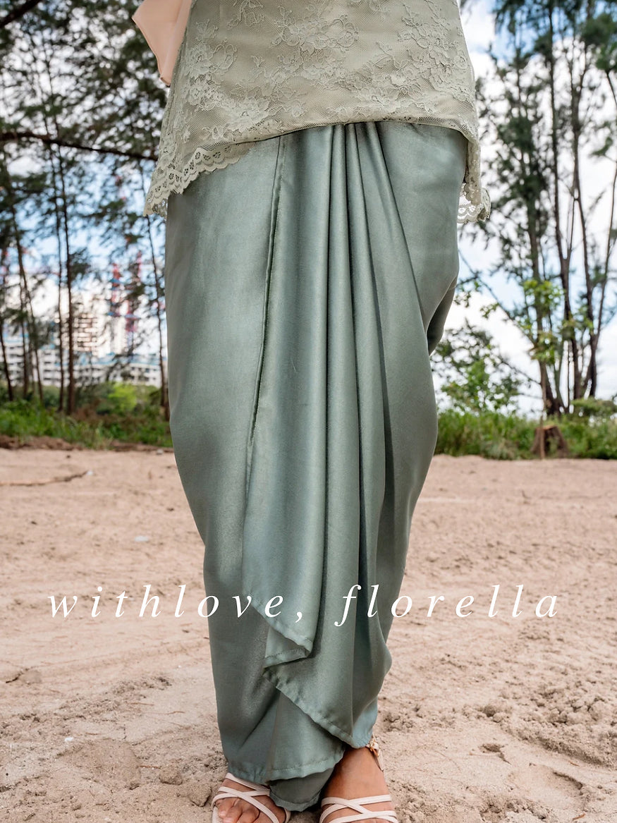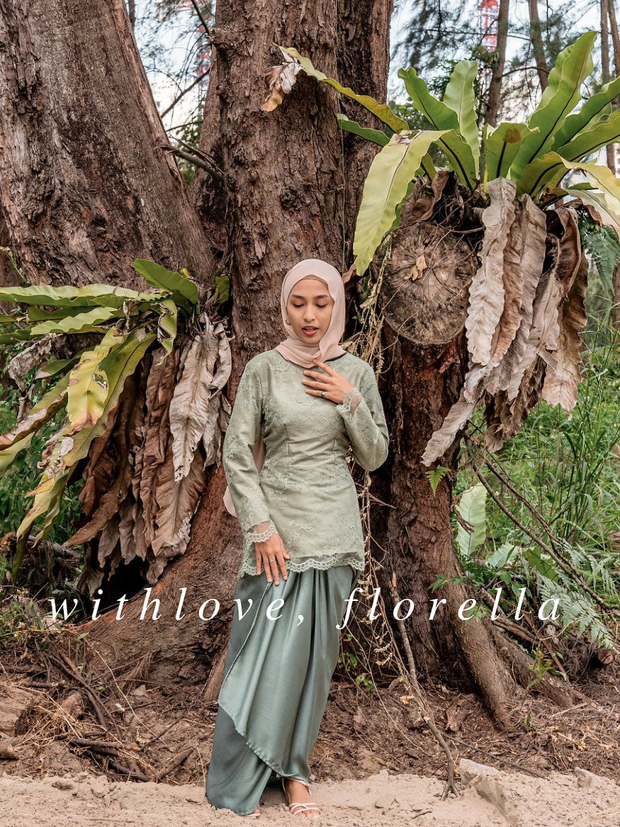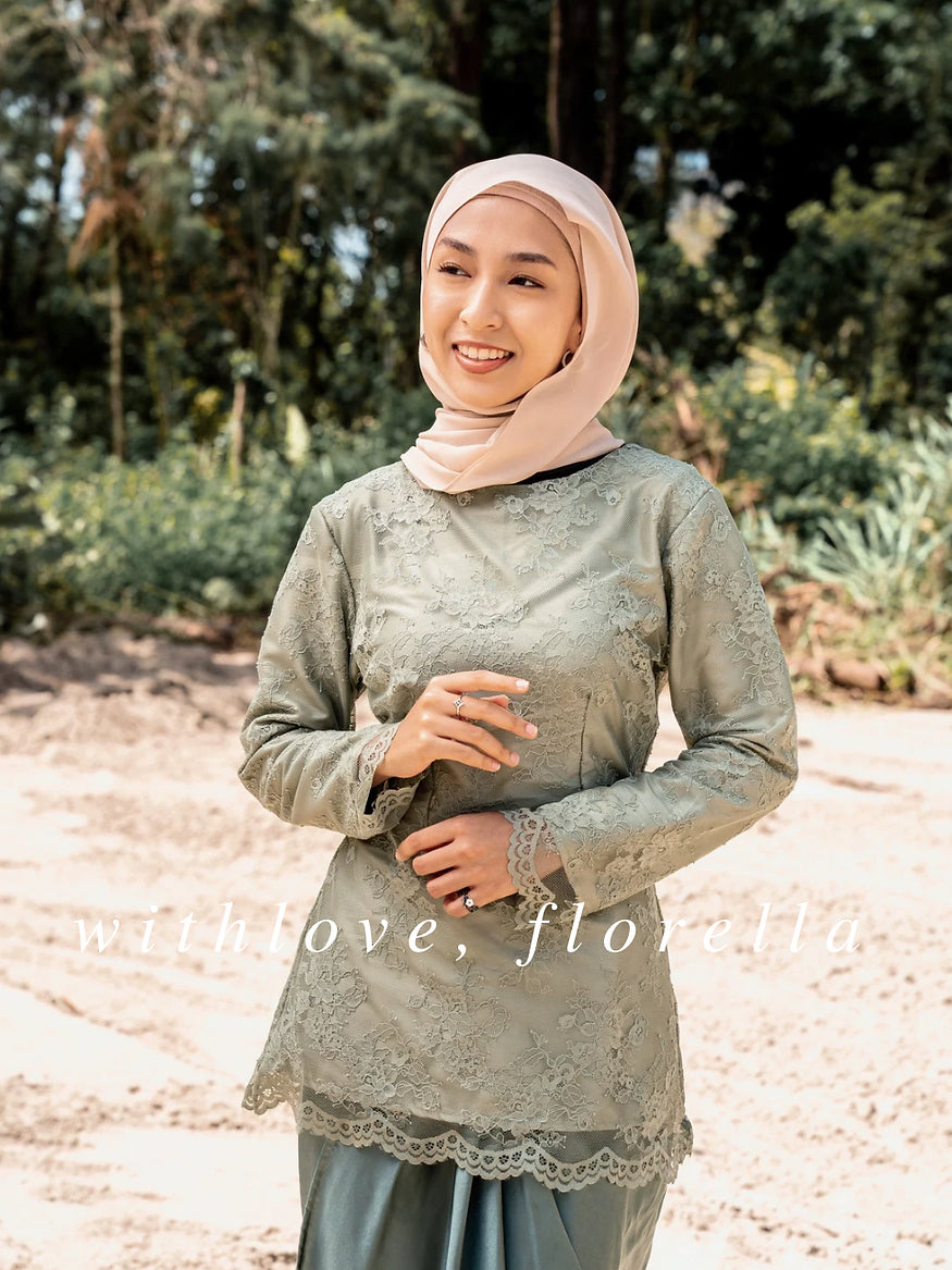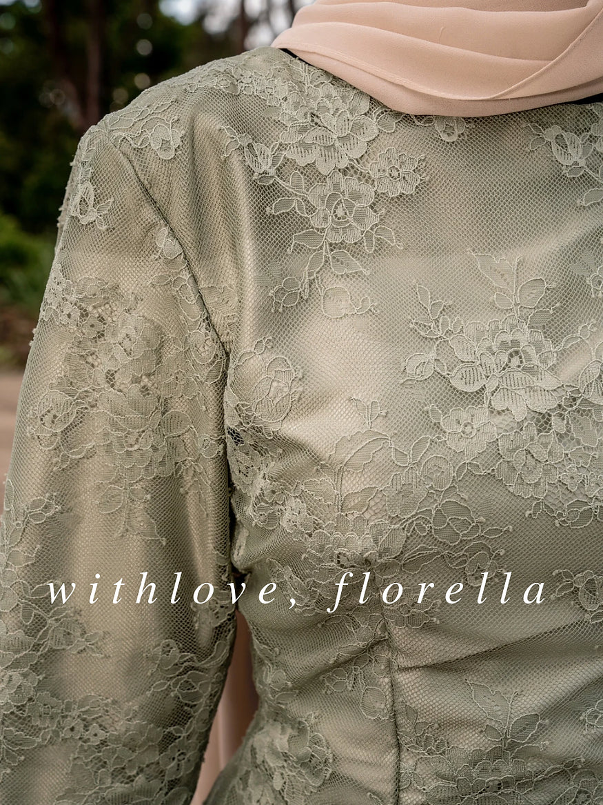 The piece features delicate floral lace in a serene sage green hue, exuding an ethereal charm that captivates all who behold it.