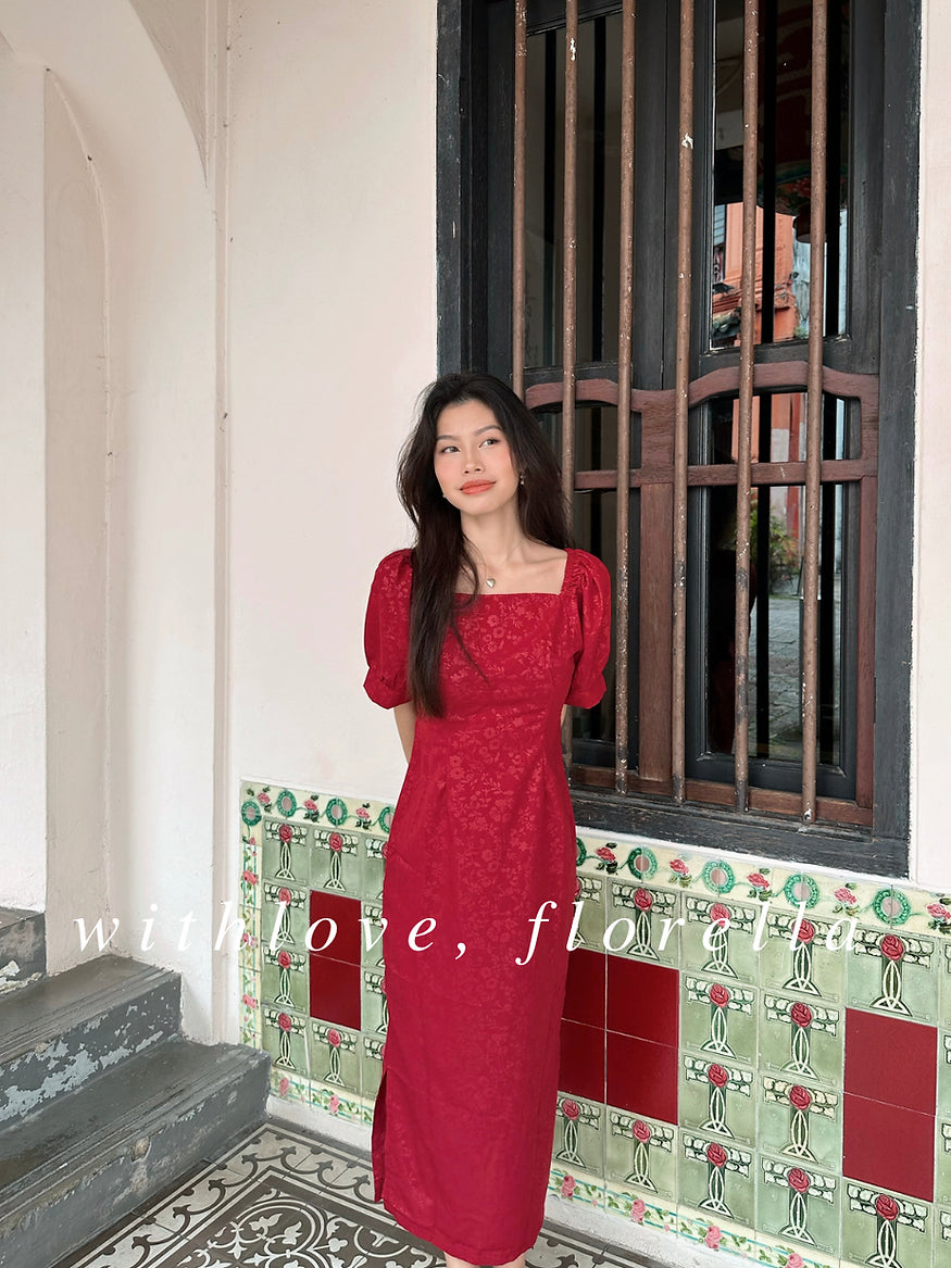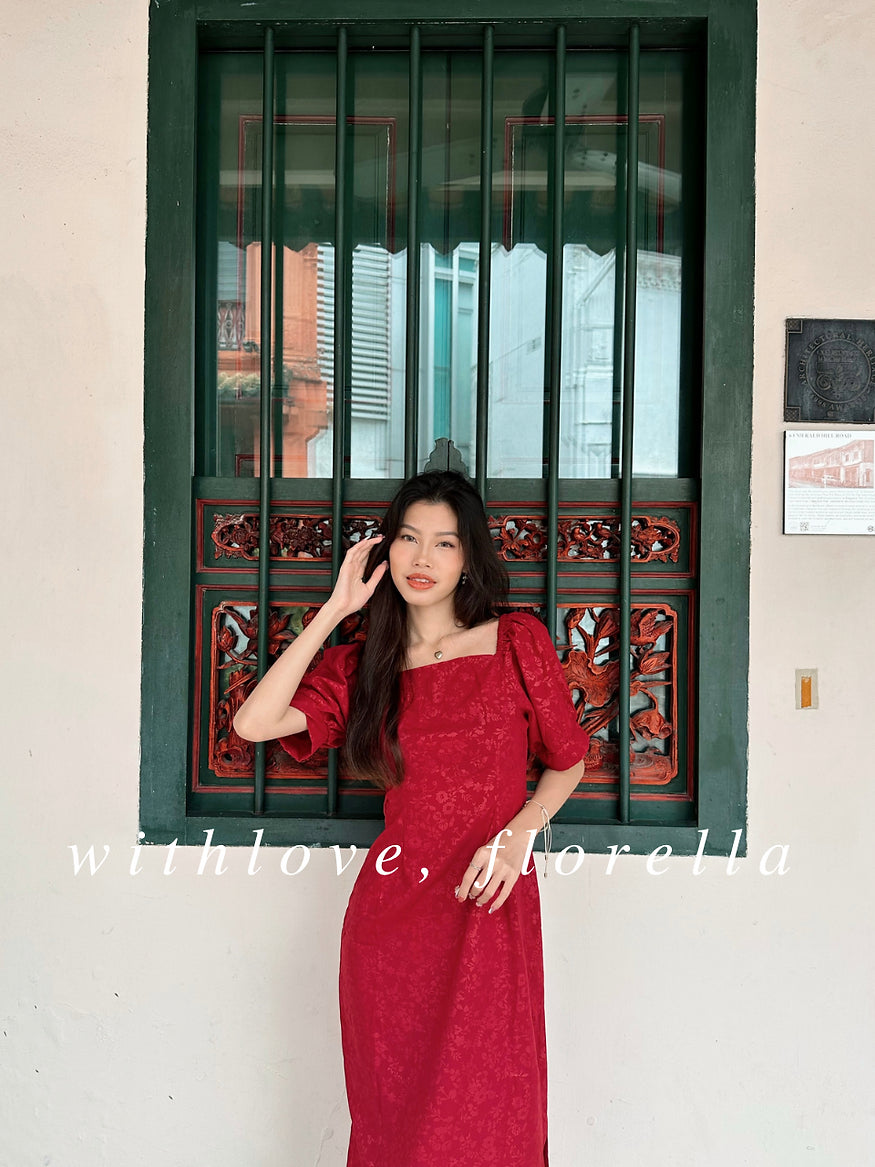 Step into the Lunar New Year with our Lunar midi dress. Adorned with subtle red floral prints on a backdrop of timeless elegance, the puffy sleeves add a touch of sophistication. With side sleeves enhancing the silhouette, this dress is a celebration of tradition and modernity, capturing the spirit of renewal and joy for the festivities ahead. Embrace the auspicious allure of radiant blossoms as you welcome the new year in style.