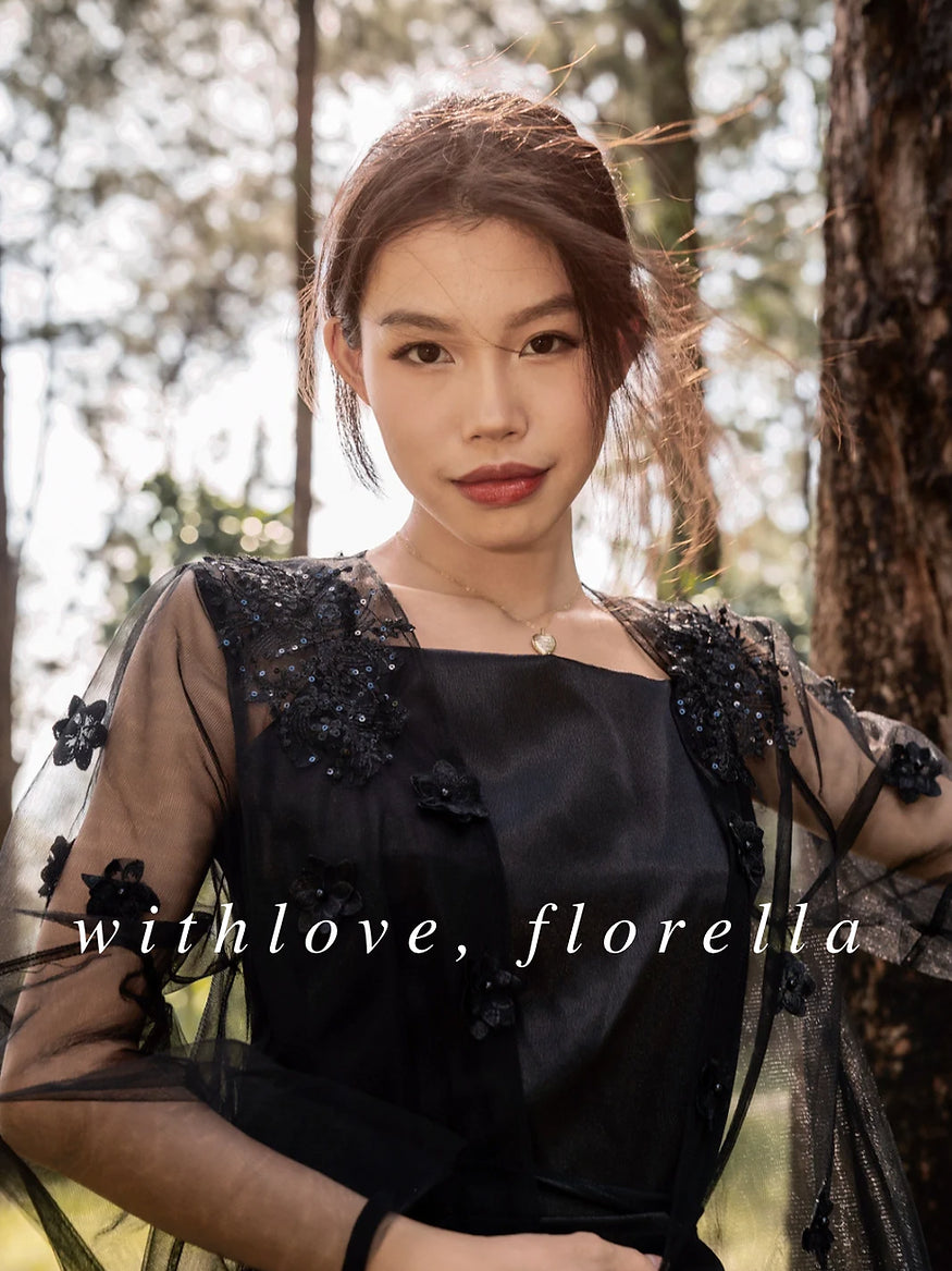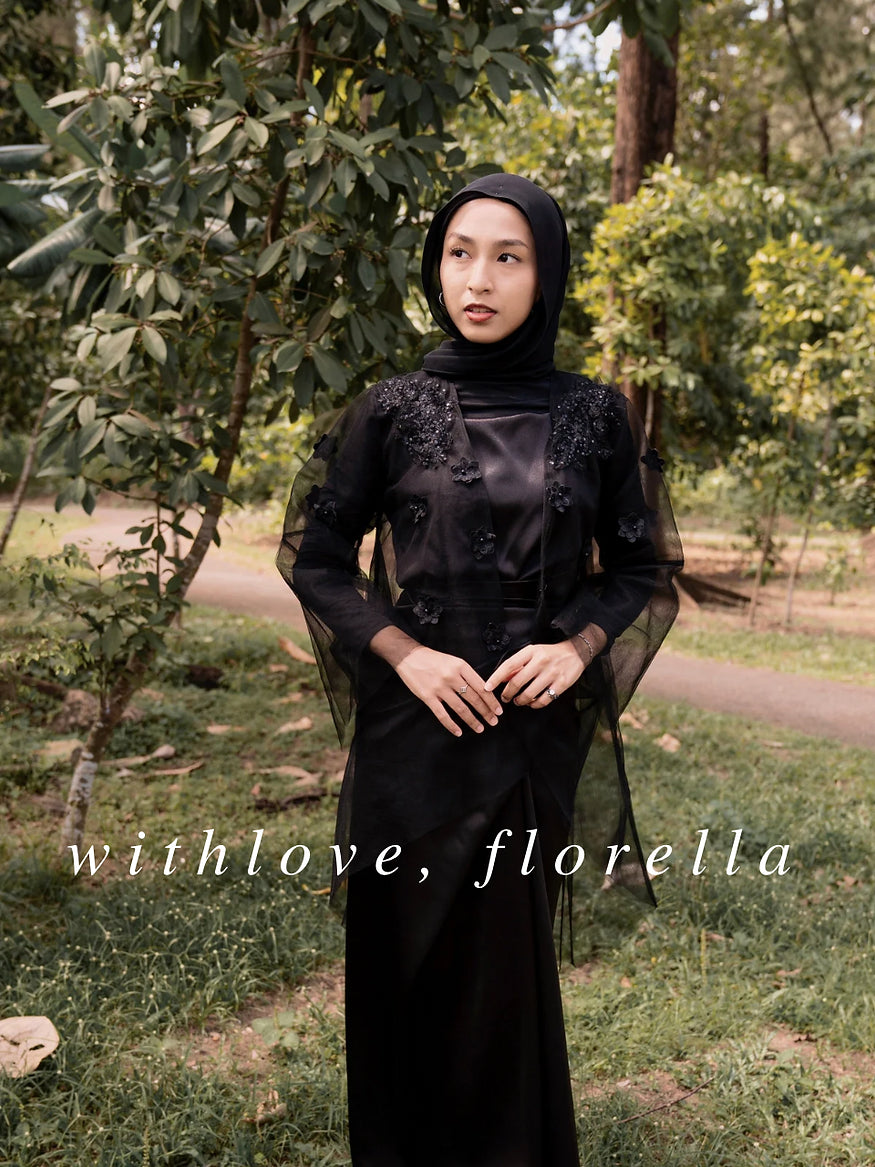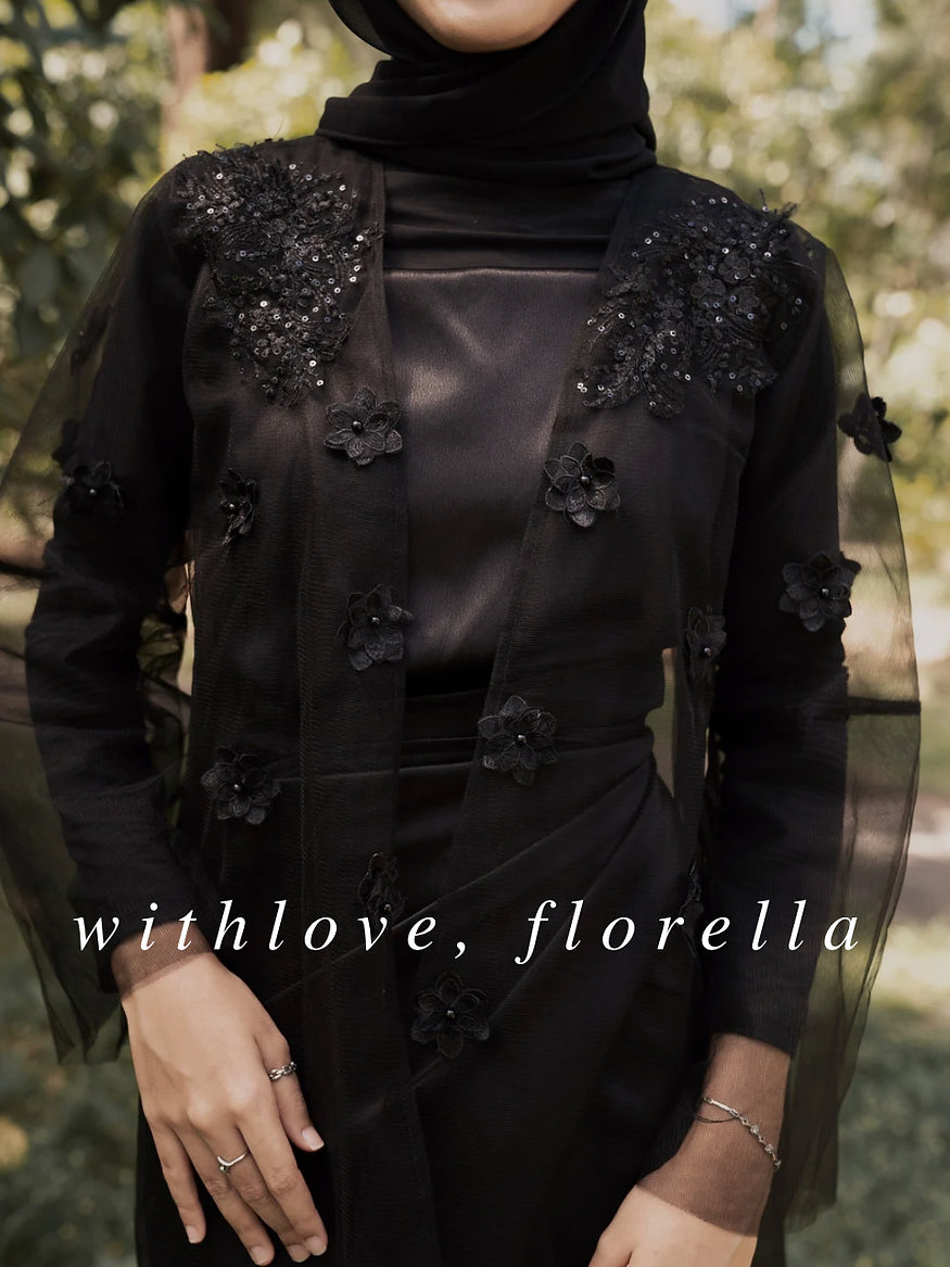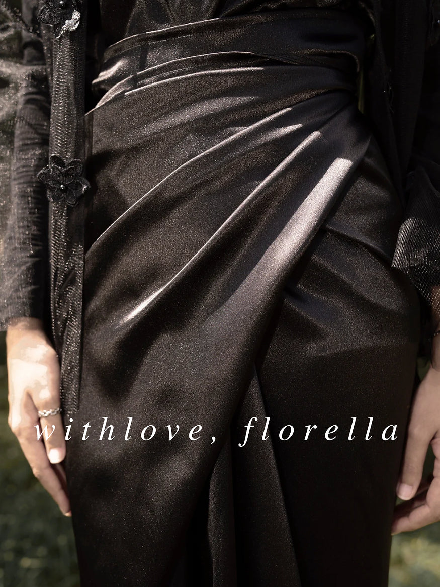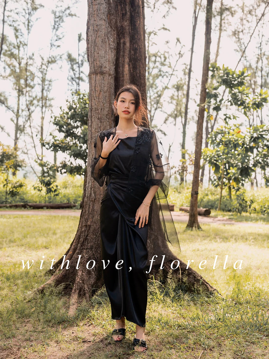 The piece features a black sheer outerwear, adorned with intricate black pearl flowers, paired with a sleek black satin inner and skirt, captures the enigmatic charm of the night.