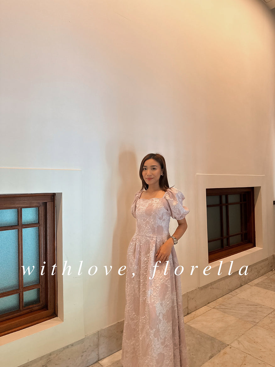With its exclusive floral details, this maxi dress promises a touch of romance and sophistication. The square neck and puffy sleeves add a modern twist to a timeless silhouette, making it the perfect choice for those seeking Bridgerton-inspired elegance.